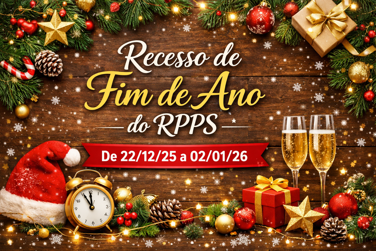 O Regime Próprio de Previdência Social (RPPS) informa que, em conformidade com a Portaria n.º 1.247, de 12 de dezembro de 2025, haverá Recesso de Final de Ano no período de 22 de dezembro de 2025 a 02 de janeiro de 2026.